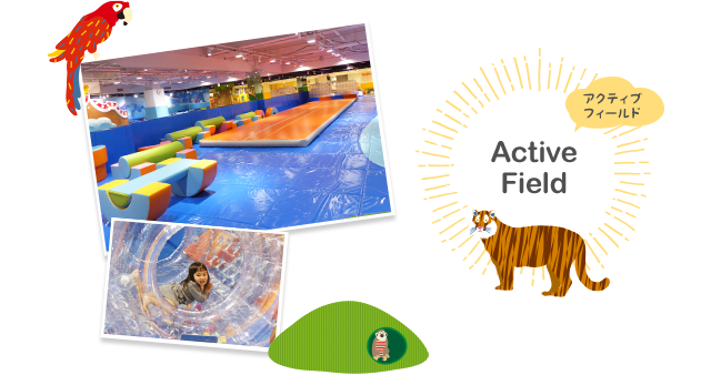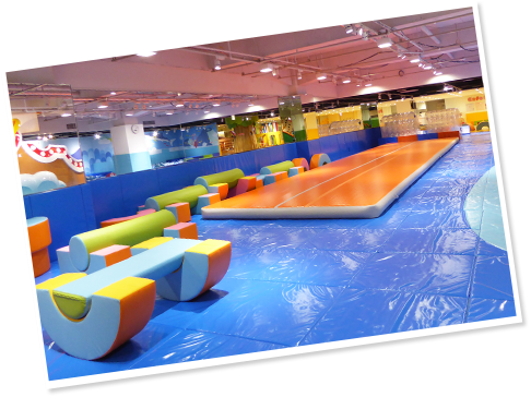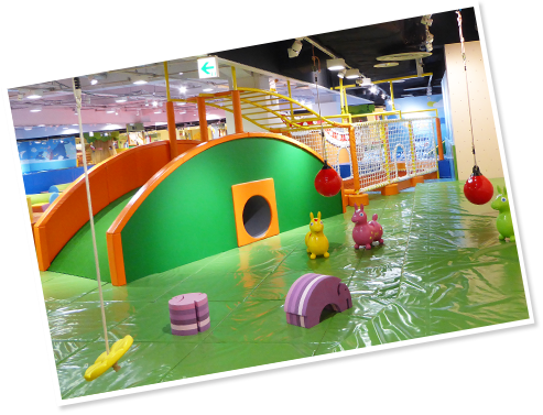 入口にそびえるキューブベース、登って渡って遊べる立体迷路です。反発力のあるトランポリンのようなオレンジマット、走る・飛び跳ねる運動をしながらバランス感覚を養います。コロコロトンネルは安全に回転運動ができ、無重力のような不思議な体験ができます。
