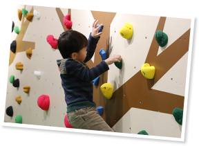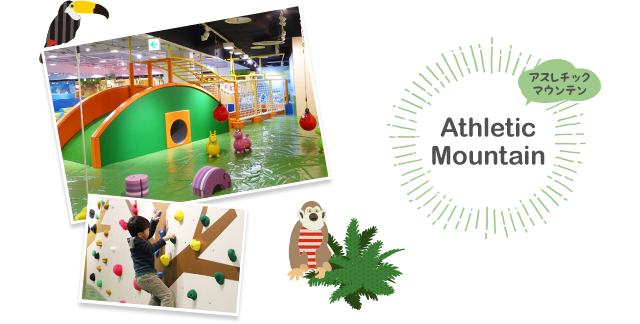 エントランスにそびえる丘と立ちはだかる壁!アスレチックマウンテンでは、身体全身を使ってのぼる過程で、一つ一つ判断する楽しさを味わうことができます。イエローブリッジ(うんてい)を追加しました!ボールの海まで渡っていけるかな?